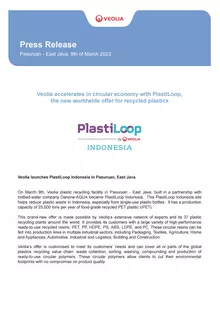 On March 9th, Veolia plastic recycling facility in Pasuruan - East Java, built in a partnership with bottled-water company Danone-AQUA became PlastiLoop Indonesia. This PlastiLoop Indonesia site helps reduce plastic waste in Indonesia, especially from single-use plastic bottles. It has a production capacity of 25,000 tons per year of food-grade recycled PET plastic (rPET).